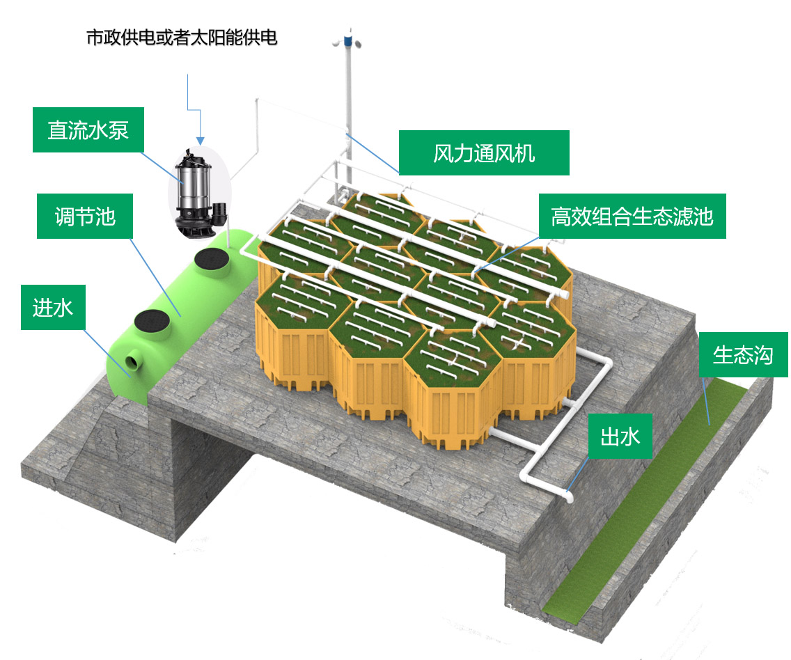 生物滤池(微动力): 适用于连片k8凯发化利用 标准化装配式处理单元组合而成,配套布水系统、生物滤料系统,结合植物供氧和强化自然复氧双重作用,实现有机物的高效去除,保留植物所需的氮磷营养元素。 适用条件: 服务常住人口:115~260人;处理规模10吨-12吨-15吨-18吨四个规模。 现场条件:人口较多,房屋相对集中,处理量≥10t/d的自然村,出水回用至农田、林地等地方k8凯发化利用。 特点:1、占地小、选址灵活,可通过调整滤池标高实现自流出水利用;2、间歇式进水,有氧无氧环境交替,强化处理效果;3、强化自然通风,出水不黑不臭。 | ![]() |